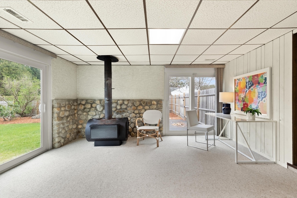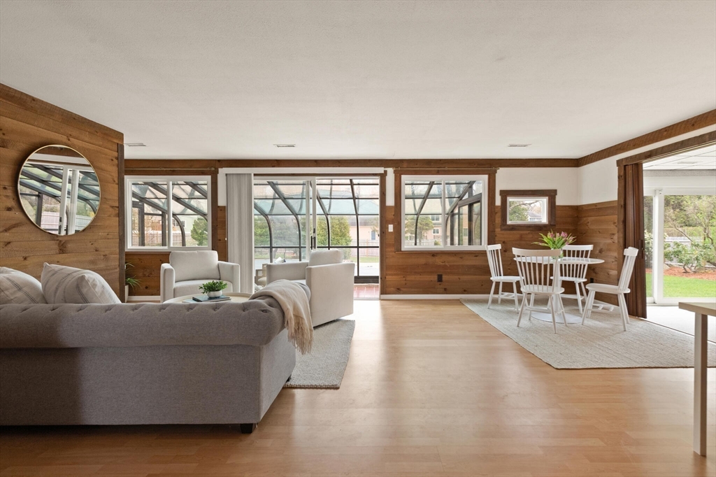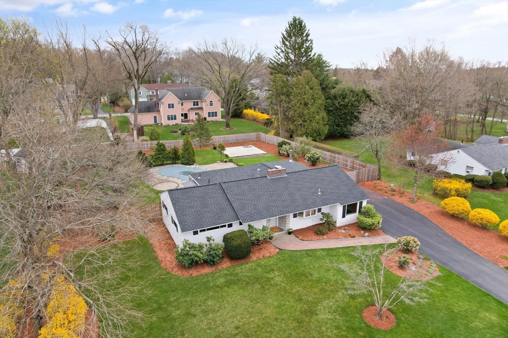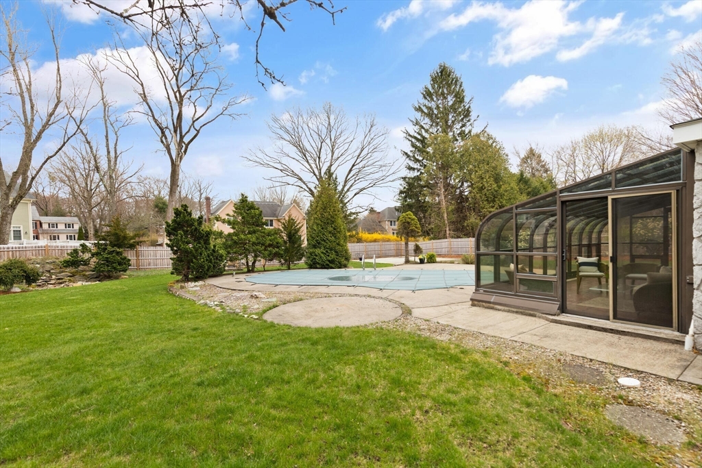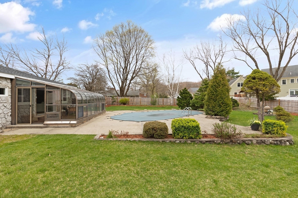 Fabulous, large, one story ranch home in a quintessential family neighborhood with a spectacular backyard. This home boasts a huge combined living room + great room plus an adjoining three season sunroom awash in light galore. These living spaces compliment three bedrooms plus an in-home office (with wood burning stove.) Separate kitchen and formal dining areas for large gatherings.The backyard offers a summer long "staycation." A half acre of level, landscaped, fenced yard with in-ground pool. Pool has not been used or opened for the past three years, so is being offered as-is. Your family and friends will delight with this outdoor haven. Walk to Harrington Elementary and easily commute via Rte 3, 128 or Rte 2 to Boston or Burlington. Come explore this rare offering. Open Houses on Friday, 4-6p, Sat and Sun: 12-2p or arrange for a private showing.